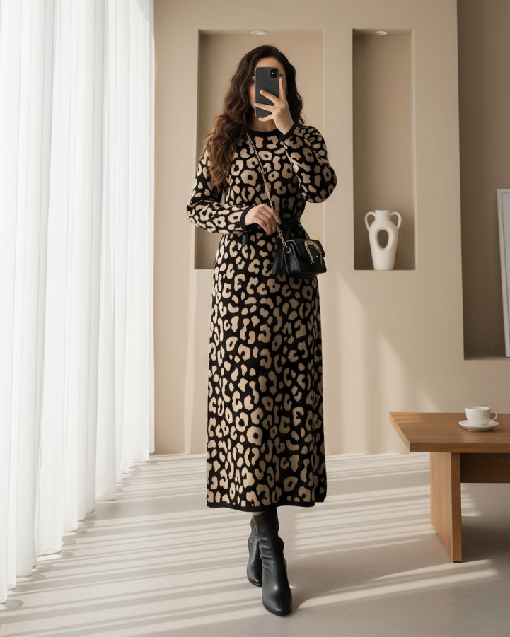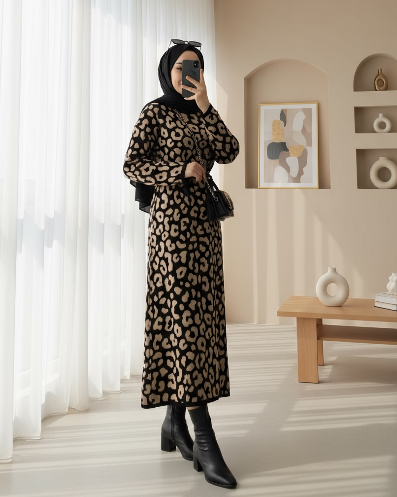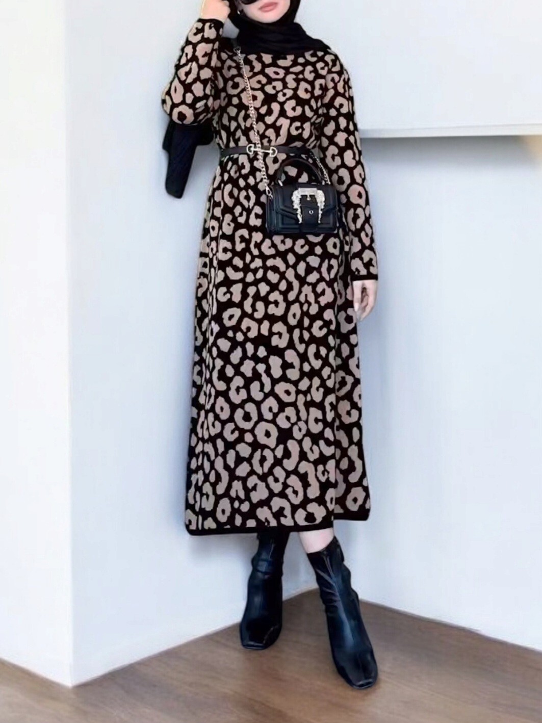 Yuvarlak Yaka Desenli Triko Elbise -Siyah-Siyah