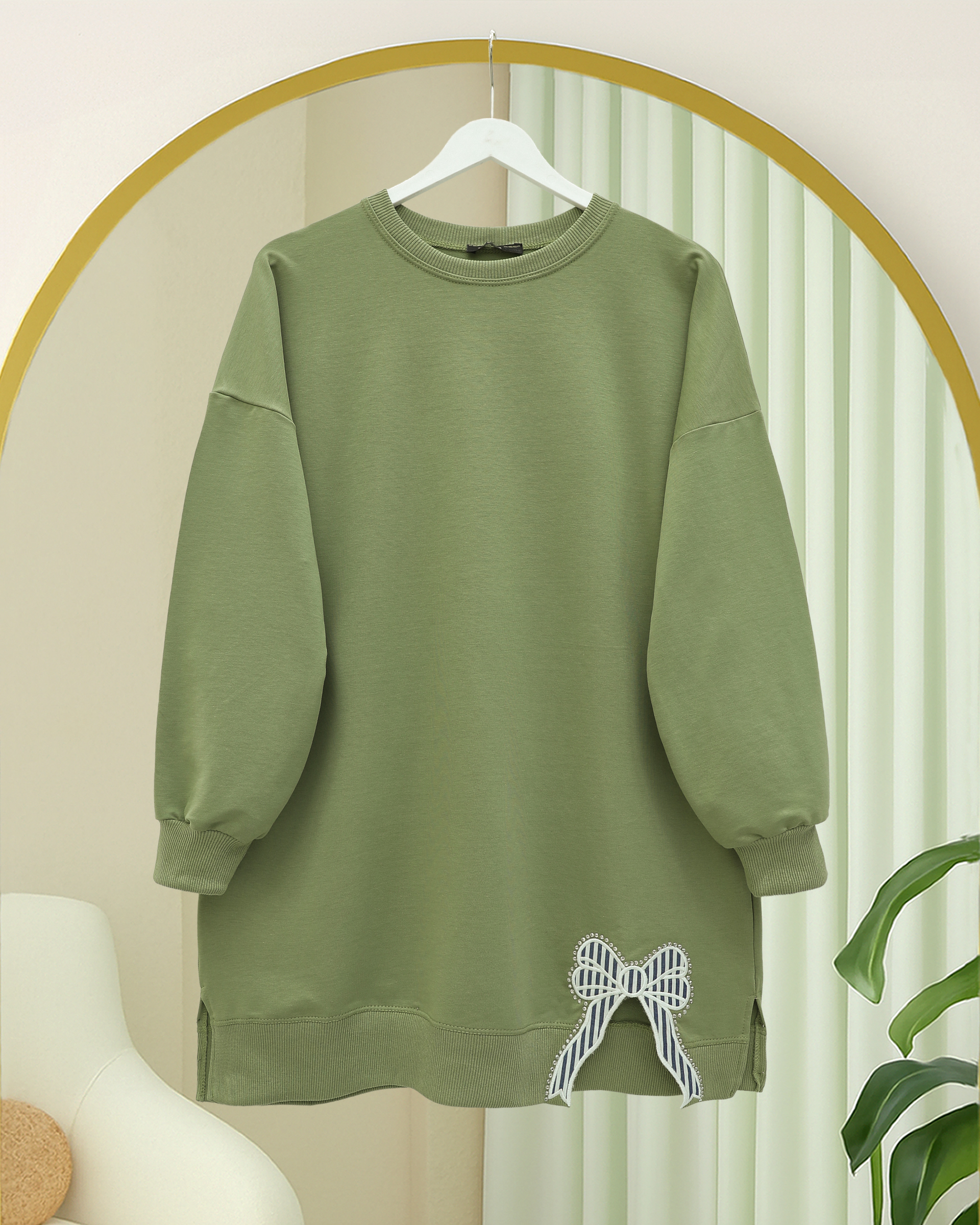 Yuvarlak Yaka Eteği Fiyonk Detaylı Salaş Penye Tunik -Çağla Y.-Çağla Y.