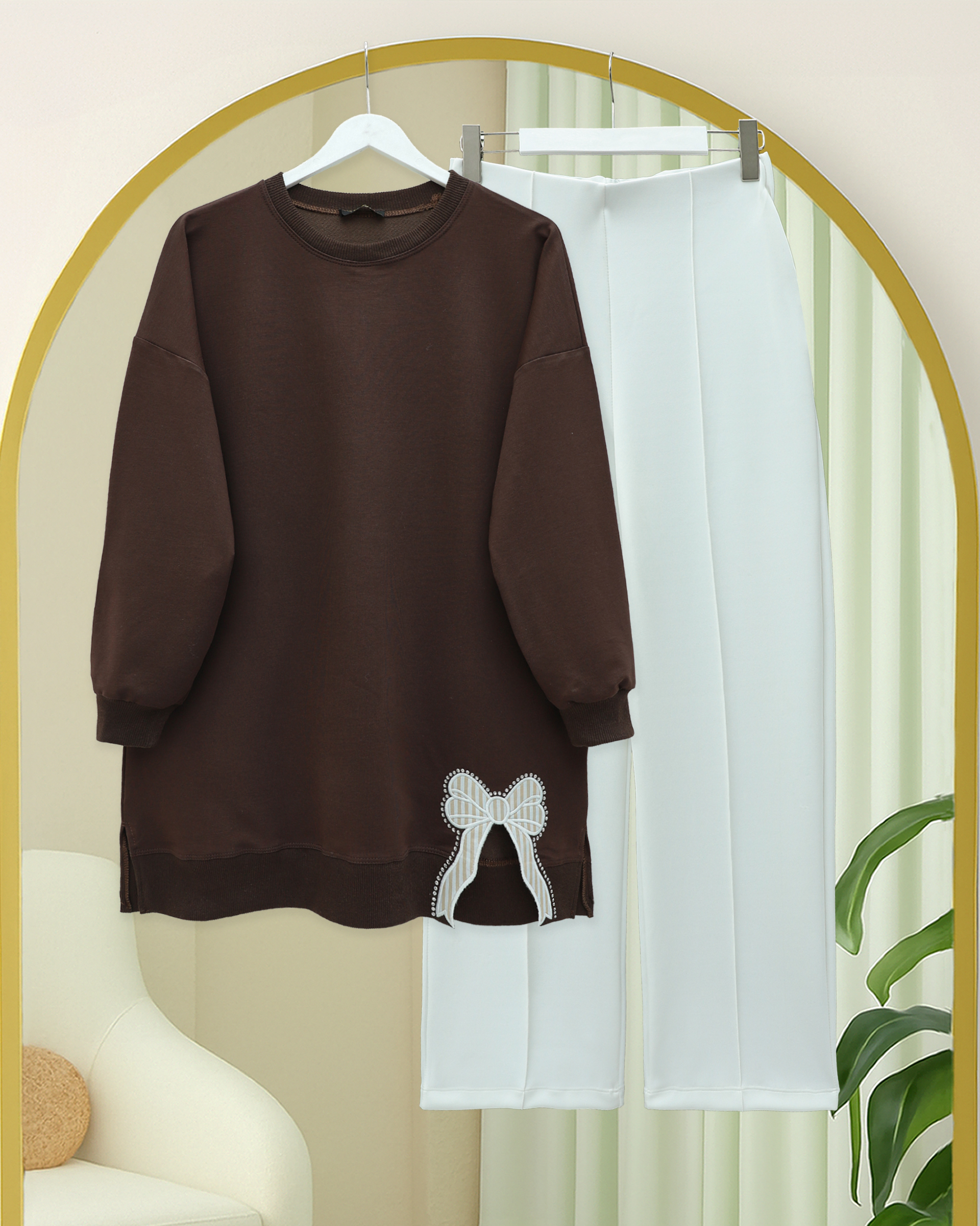 Yuvarlak Yaka Eteği Fiyonk Detaylı Salaş Penye Tunik -Kahve-Kahve