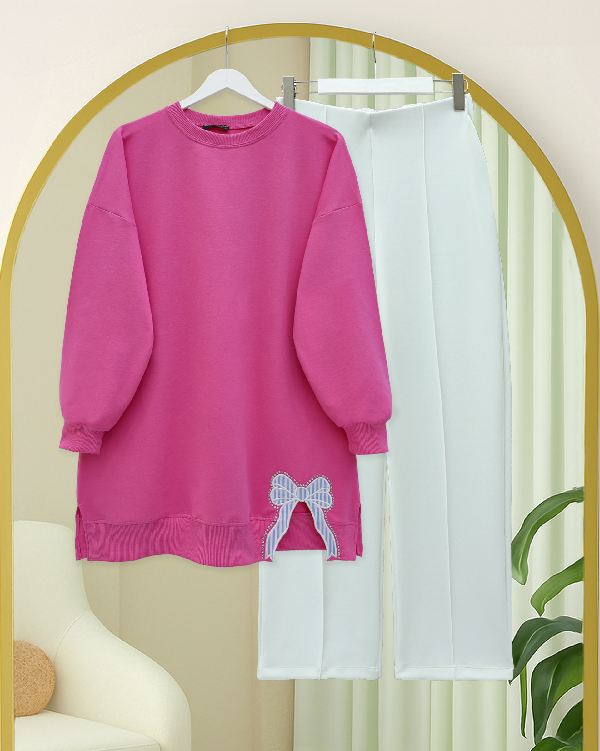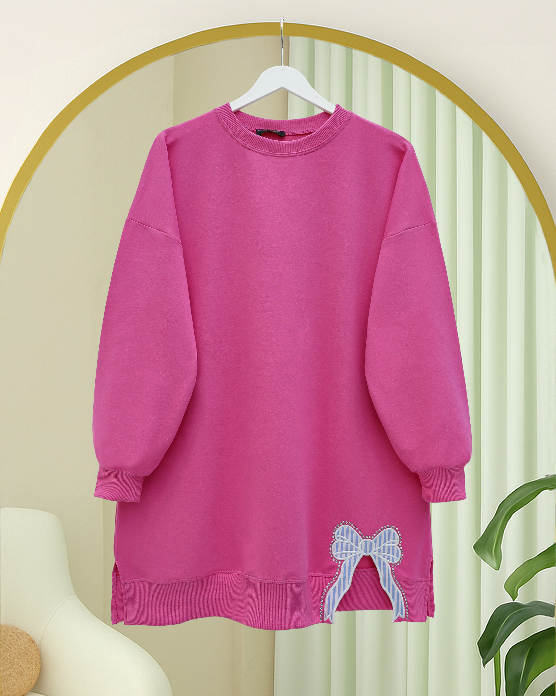 Yuvarlak Yaka Eteği Fiyonk Detaylı Salaş Penye Tunik -Pembe-Pembe