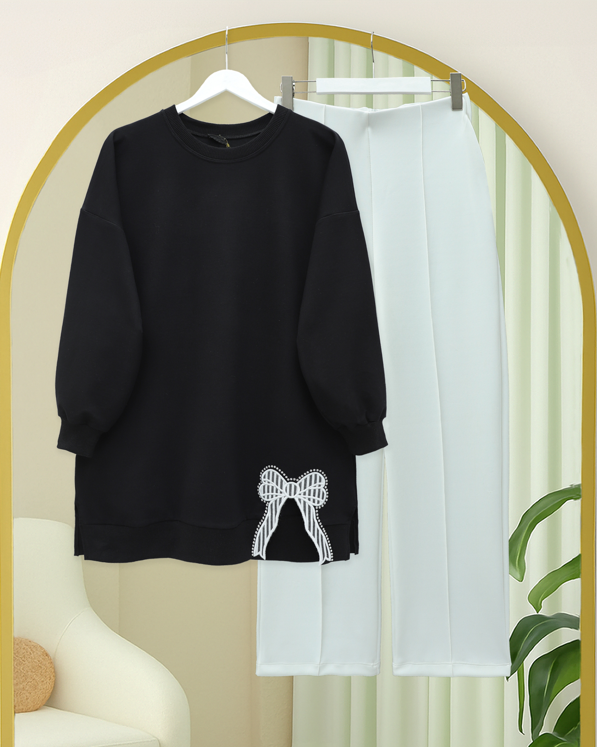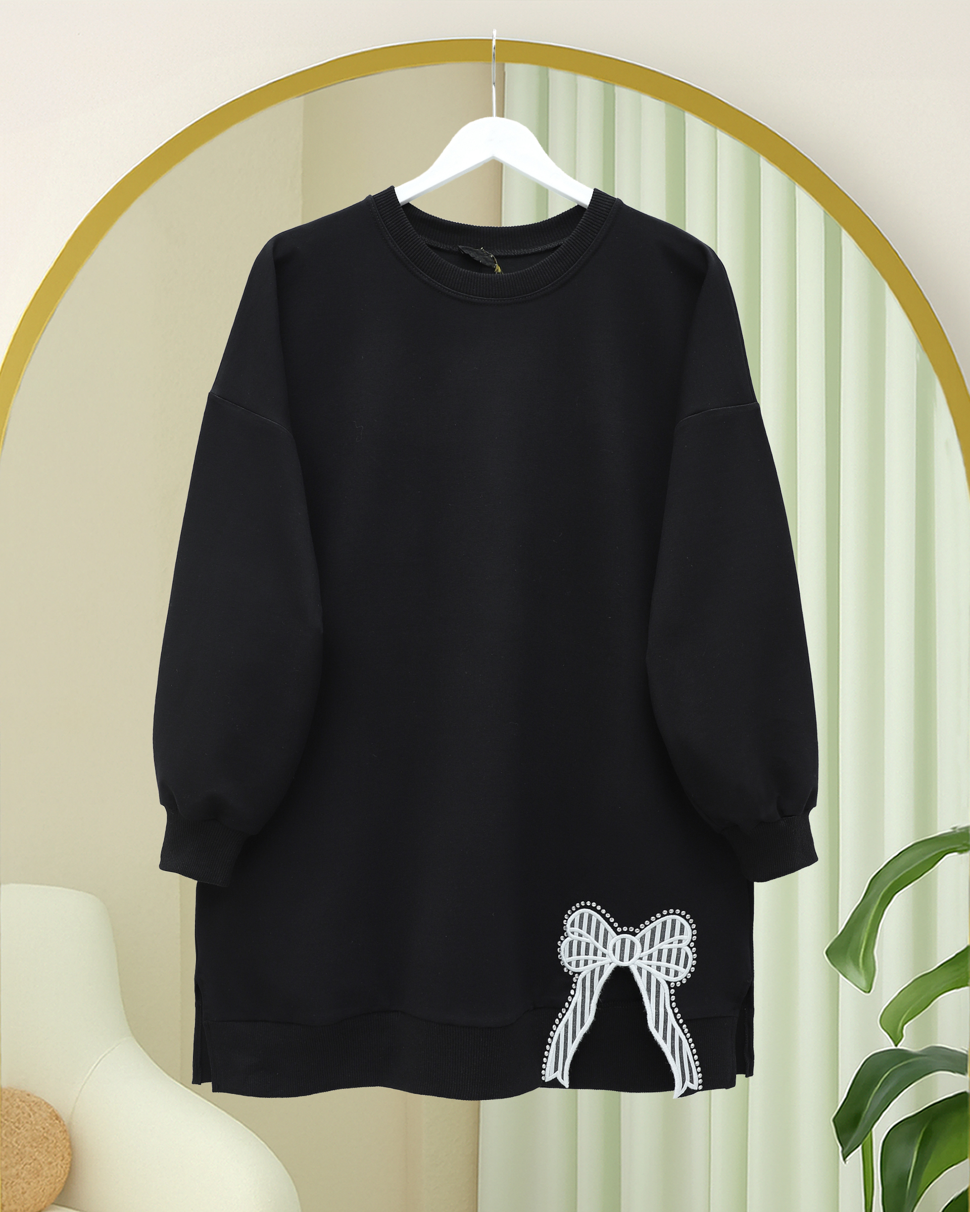 Yuvarlak Yaka Eteği Fiyonk Detaylı Salaş Penye Tunik -Siyah-siyah