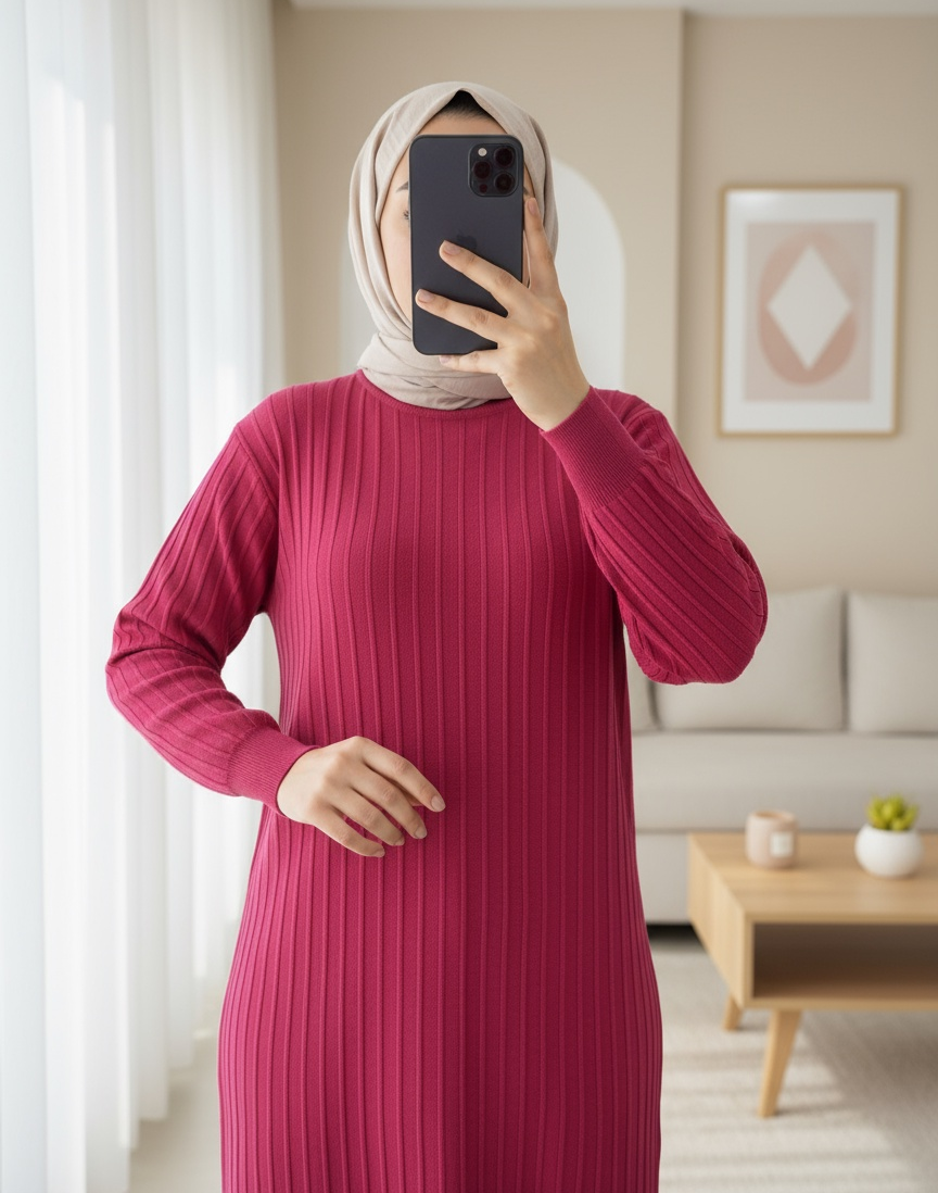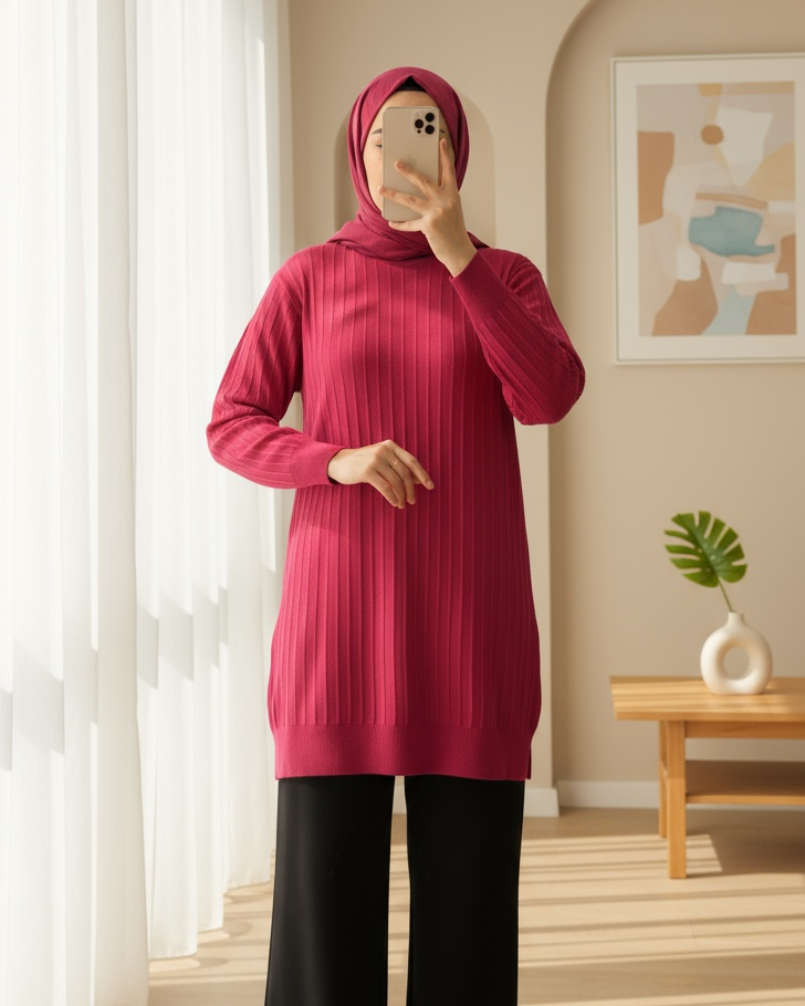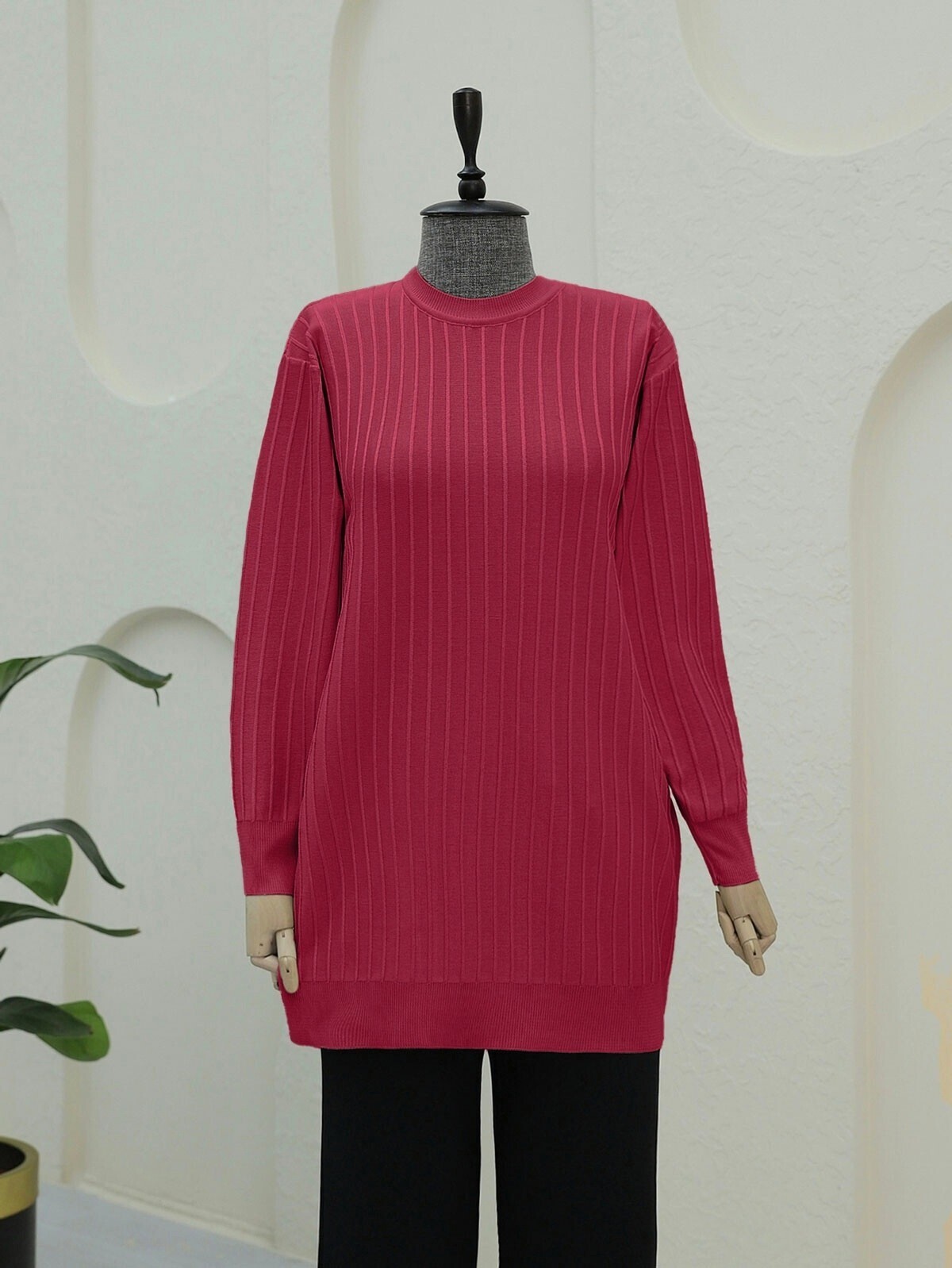 Yuvarlak Yaka İnce Çizgili Triko Tunik -Bordo-Bordo