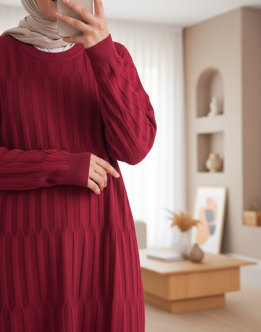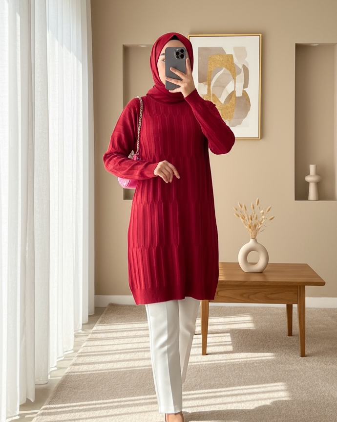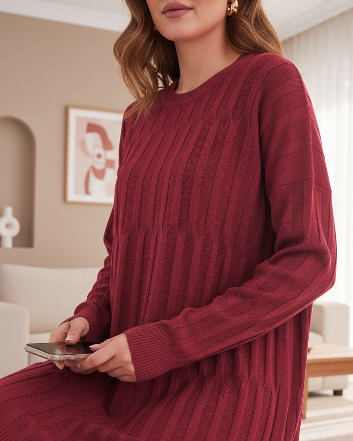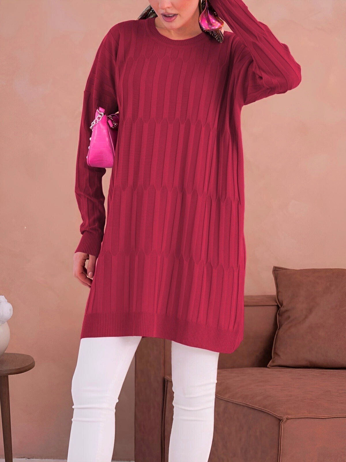 Yuvarlak Yaka Kalın Çizgili Salaş Triko Tunik -Kırmızı-Kırmızı