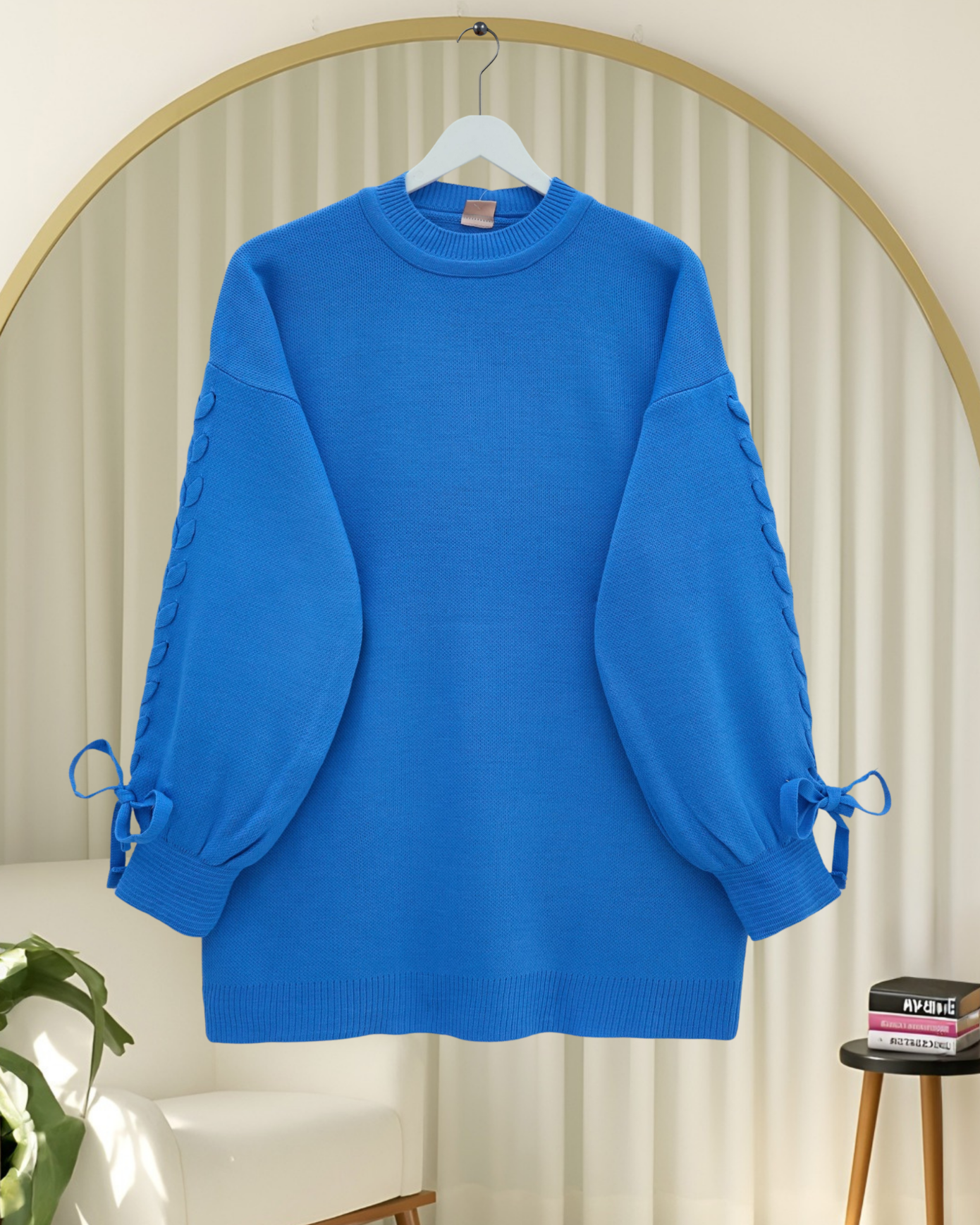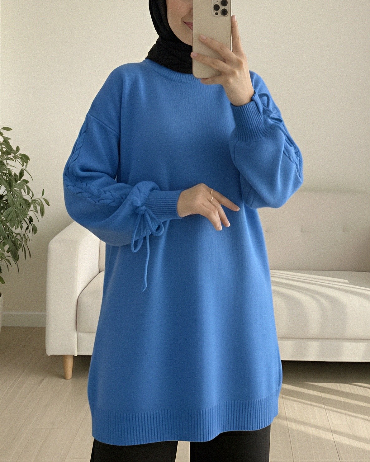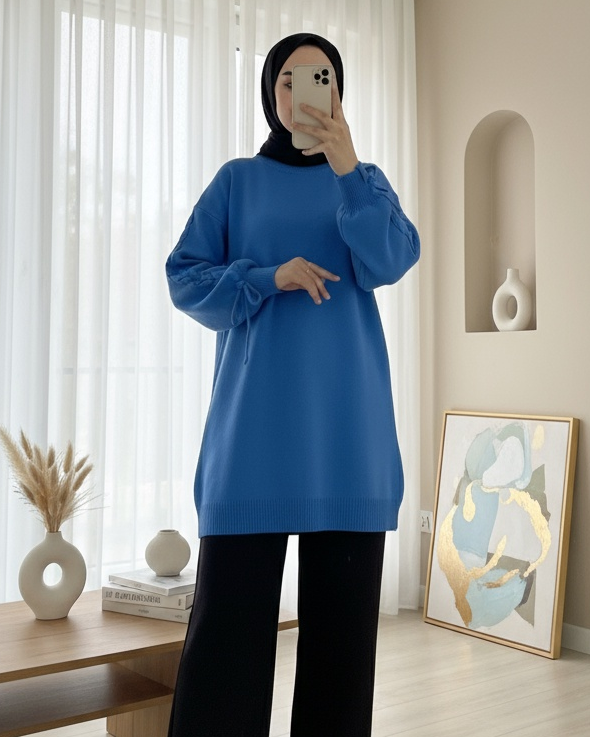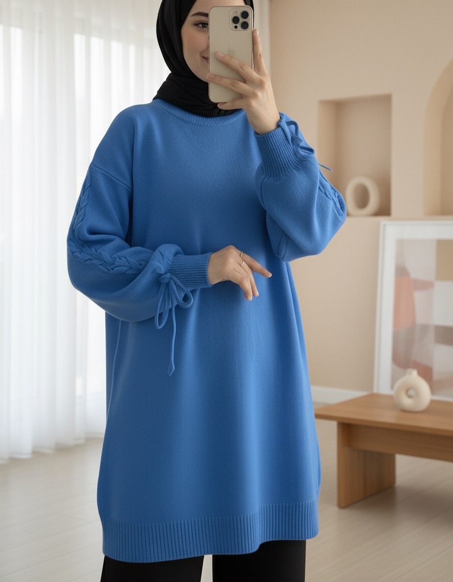Yuvarlak Yaka Kolu Örgü Detaylı Triko Kazak -Mavi-Mavi