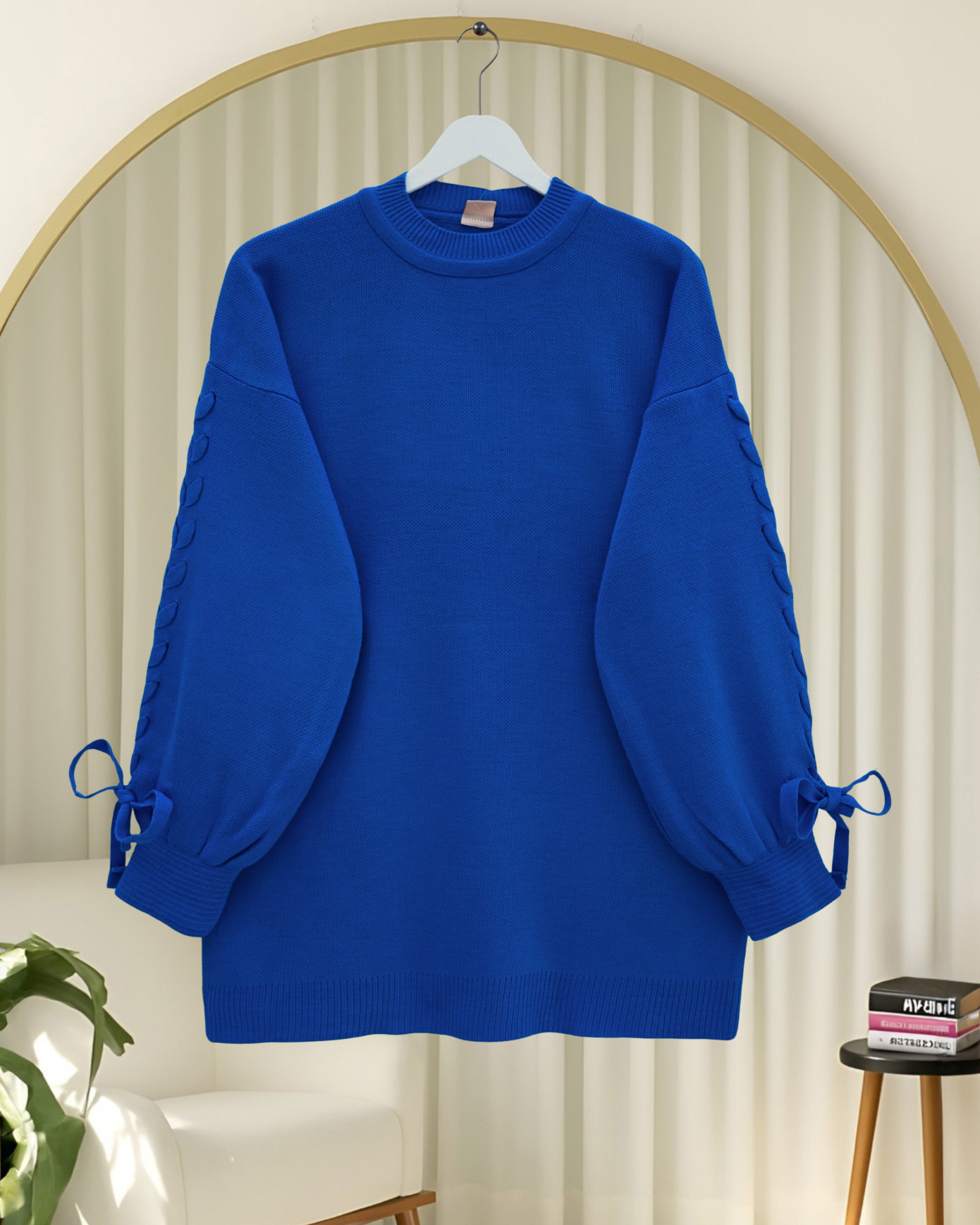 Yuvarlak Yaka Kolu Örgü Detaylı Triko Kazak -Saks-Saks