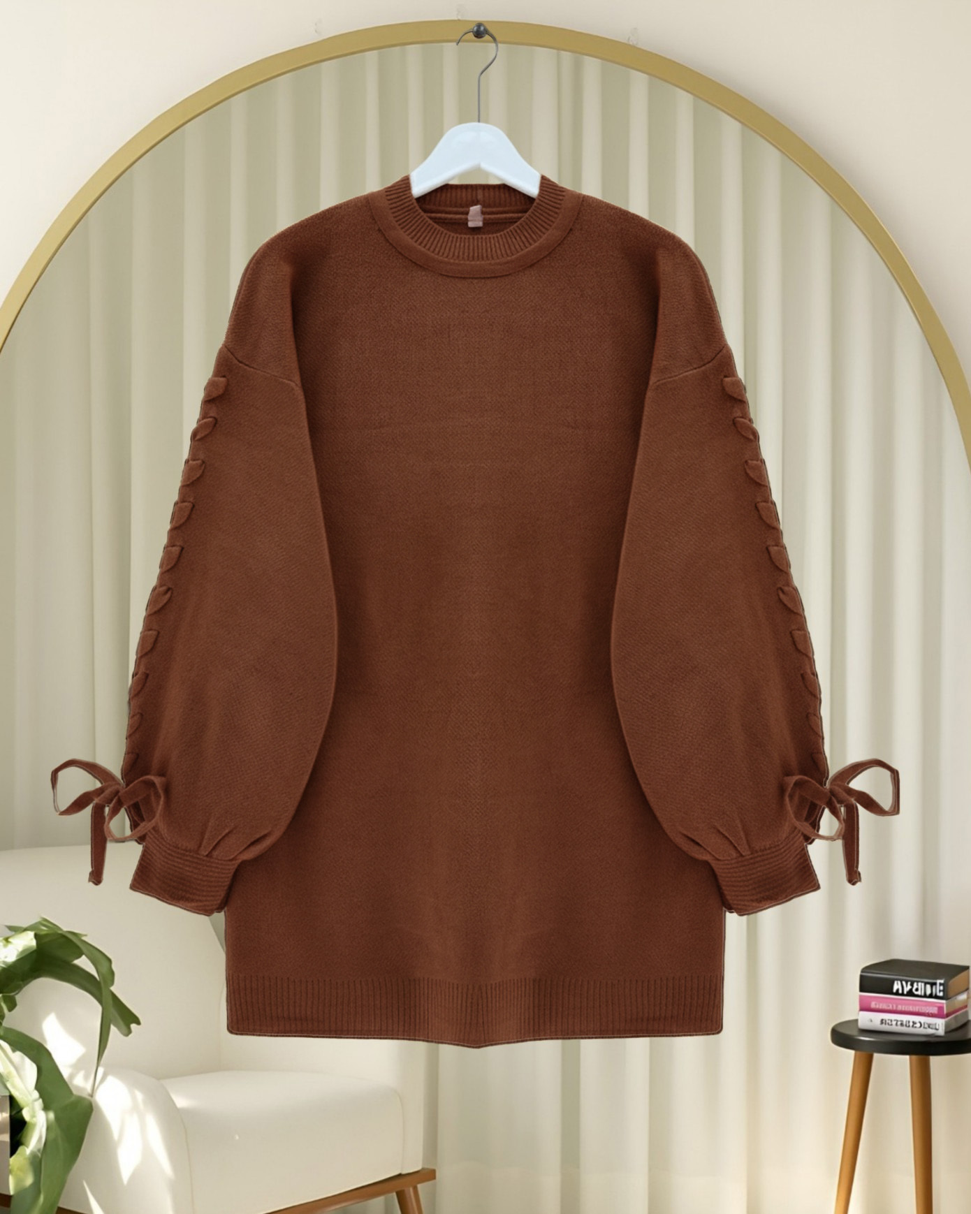 Yuvarlak Yaka Kolu Örgü Detaylı Triko Kazak -Toprak-Toprak