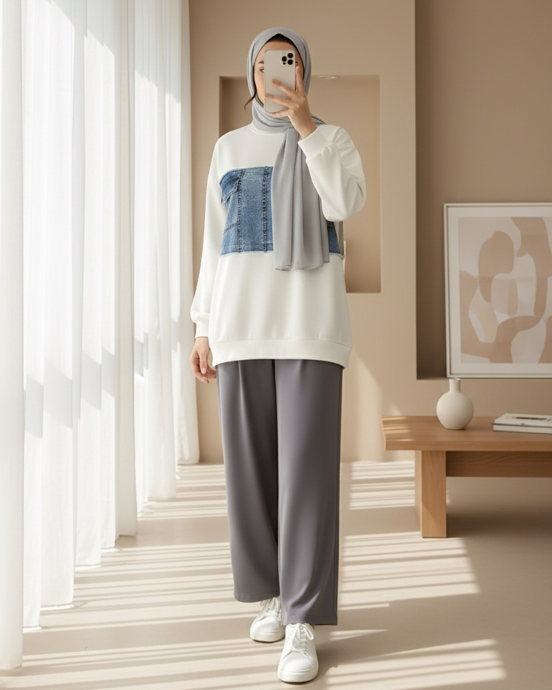 Yuvarlak Yaka Önü Kot Cep Detaylı Sweat -Beyaz-Beyaz