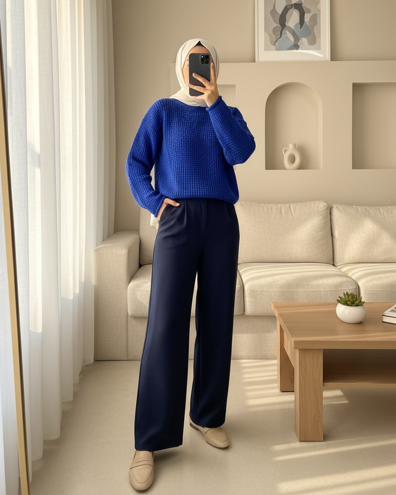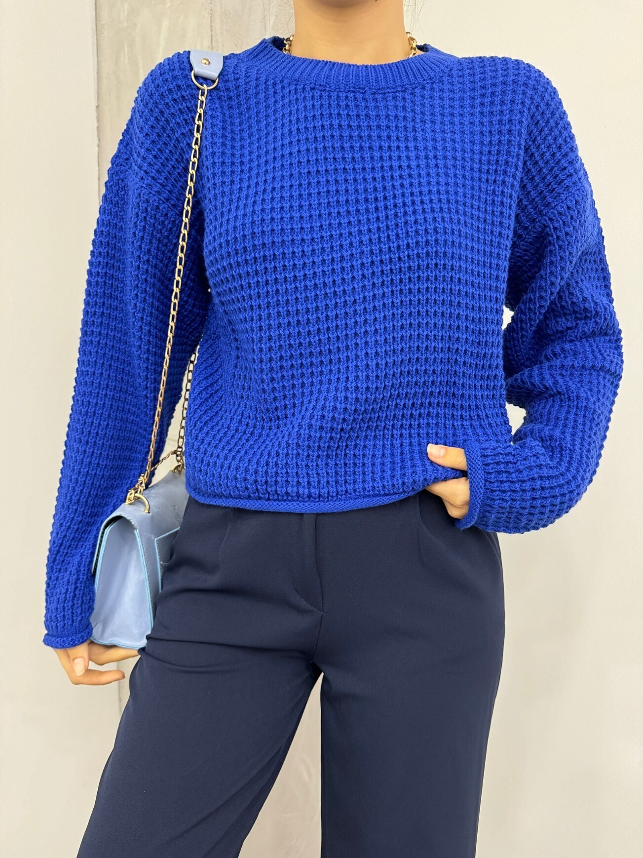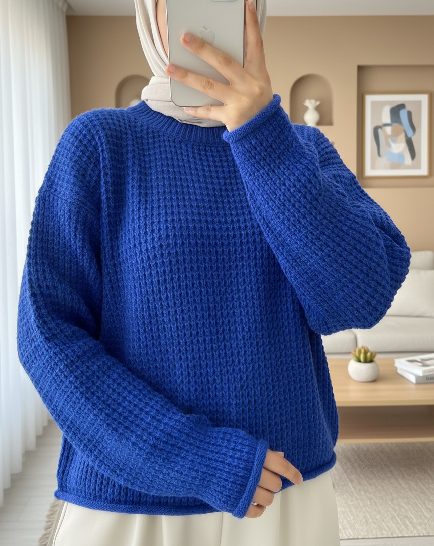 Yuvarlak Yaka Örgü Triko Kazak -Saks-Saks