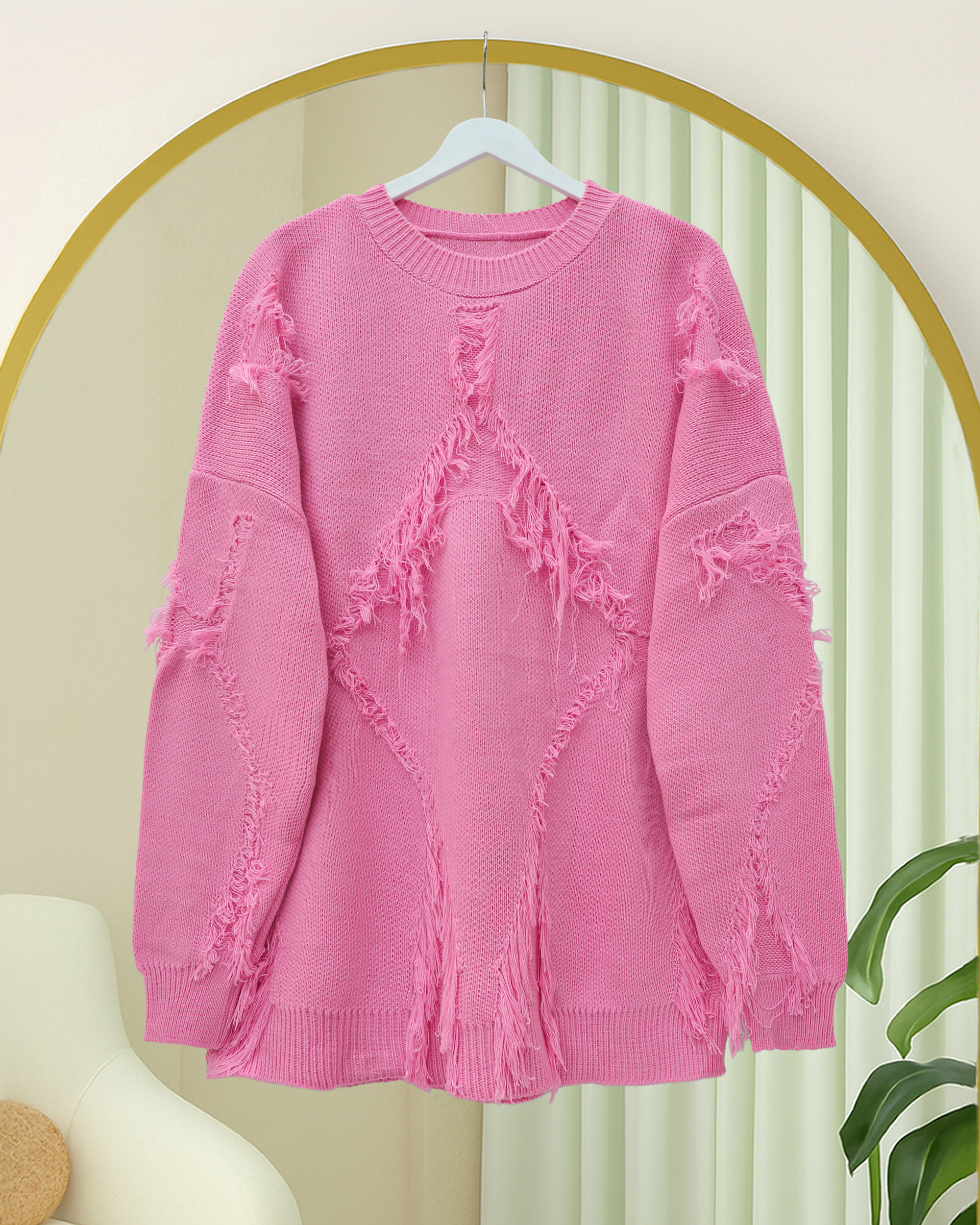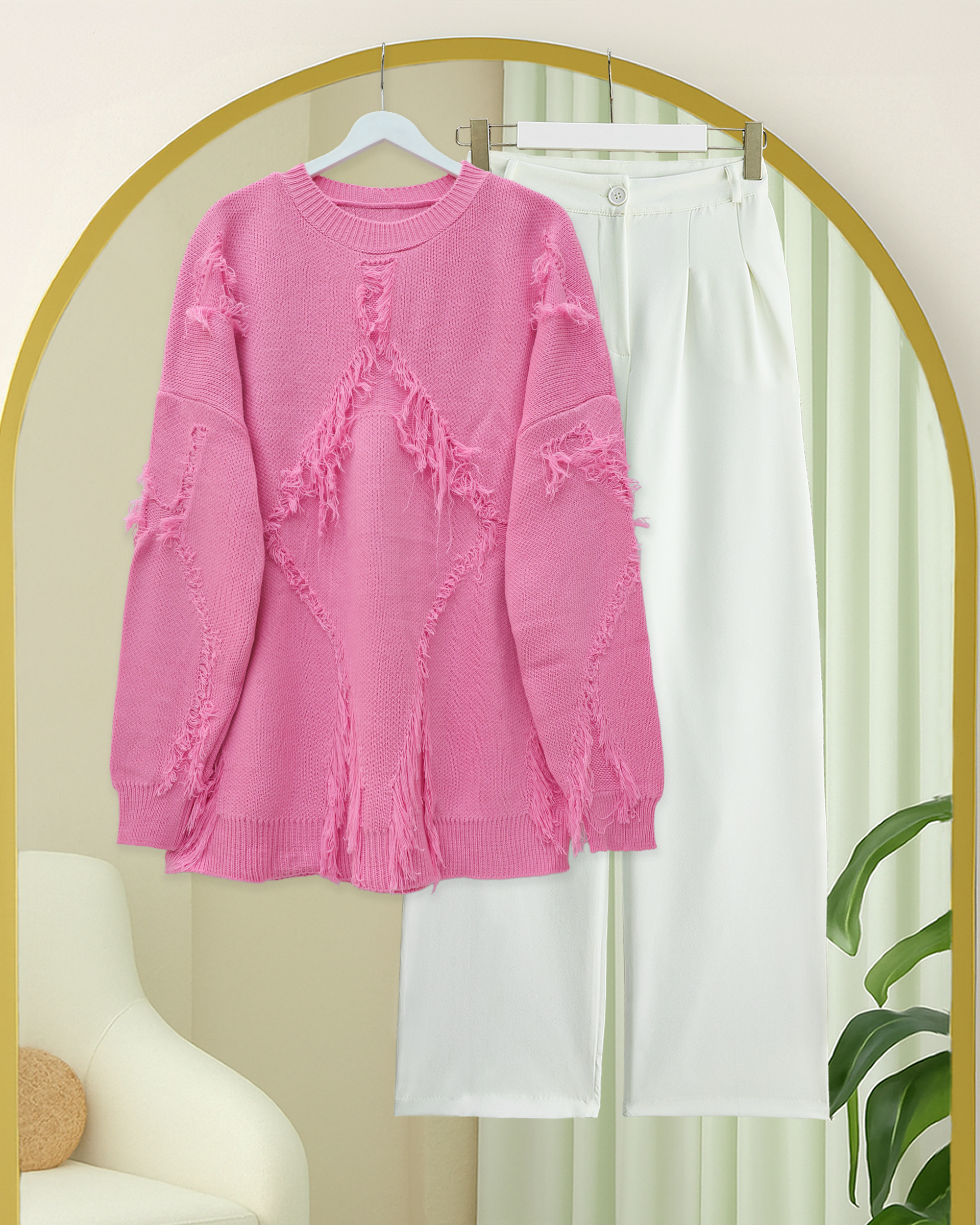 Yuvarlak Yaka Püskül Detaylı Triko Kazak -Pembe-Pembe