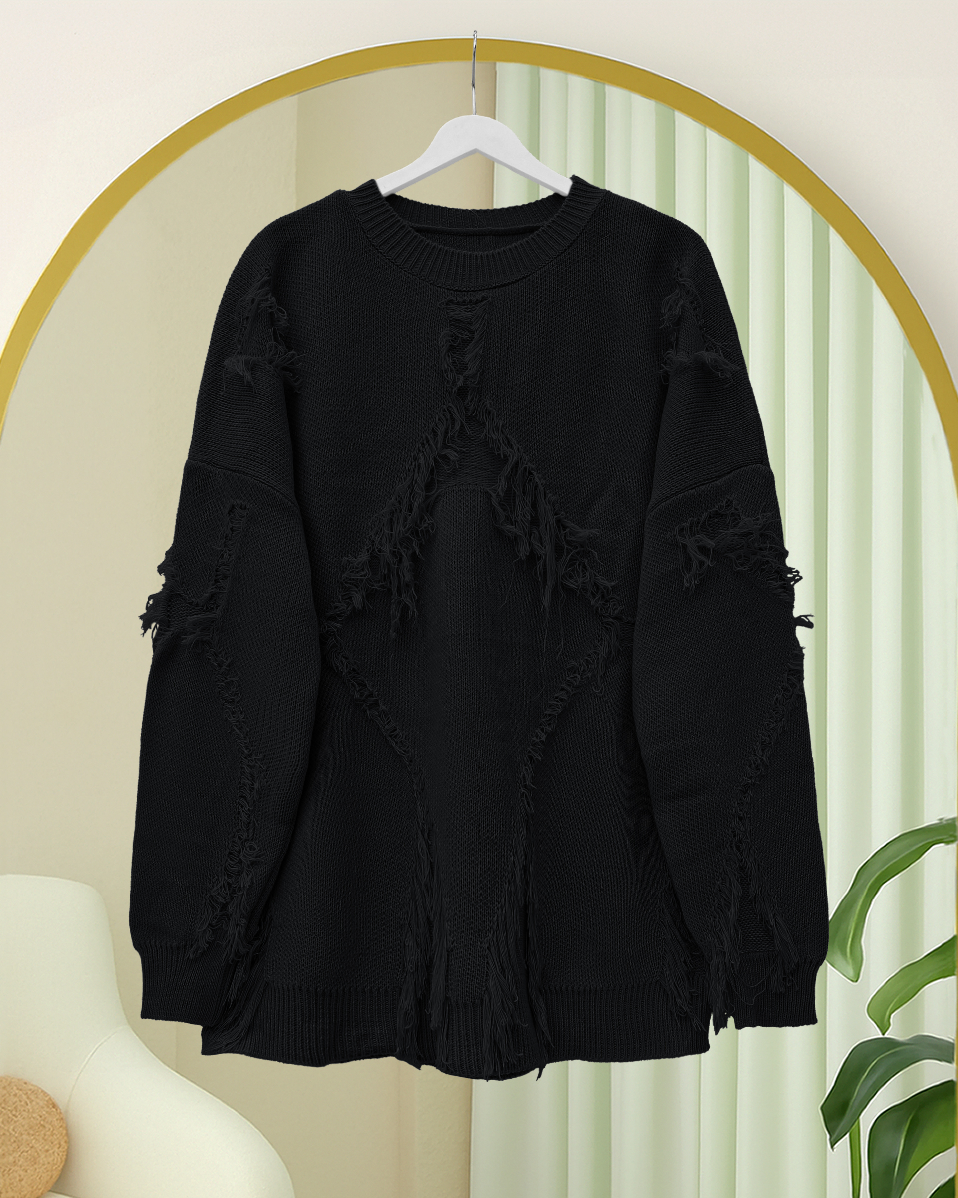 Yuvarlak Yaka Püskül Detaylı Triko Kazak -Siyah-siyah