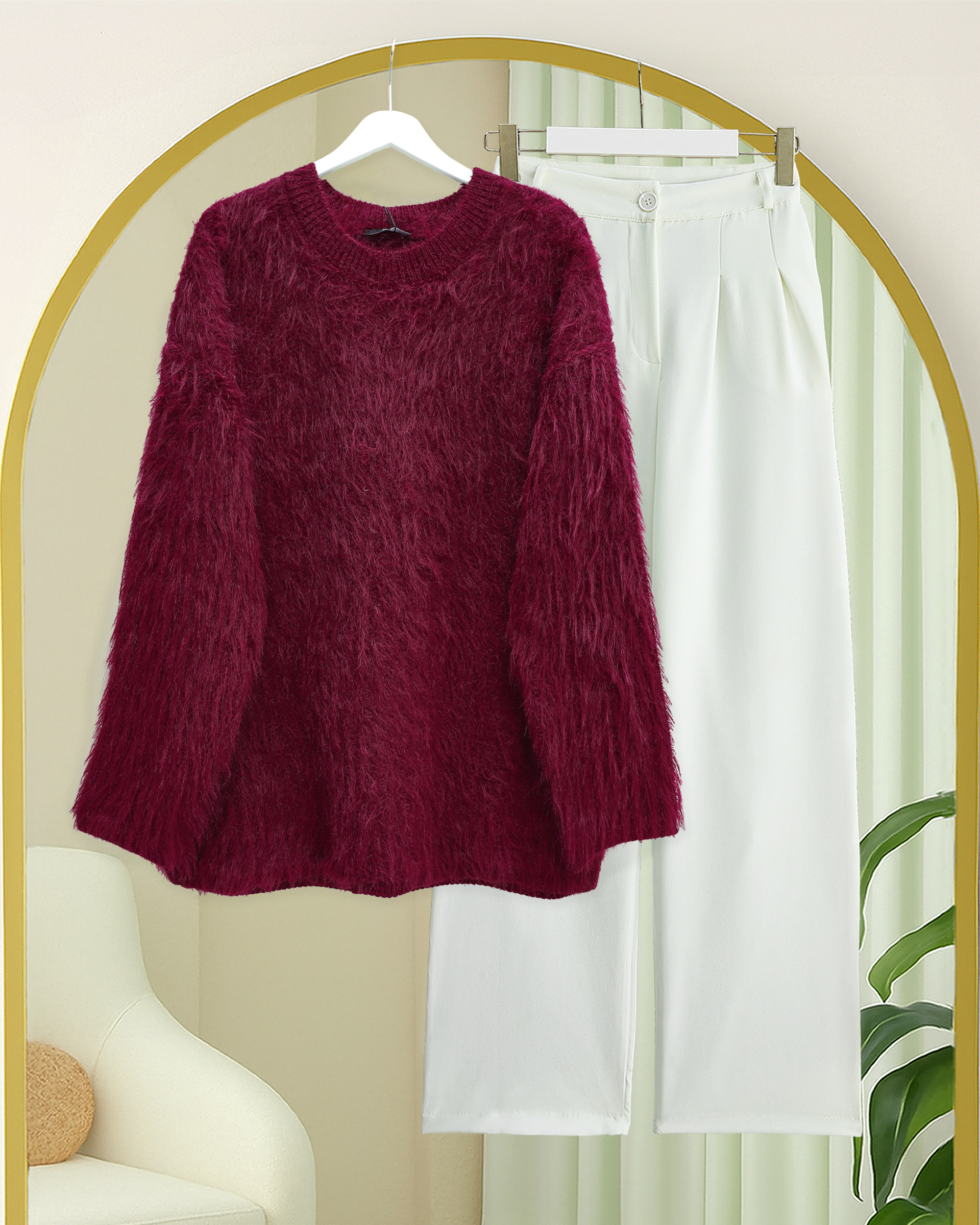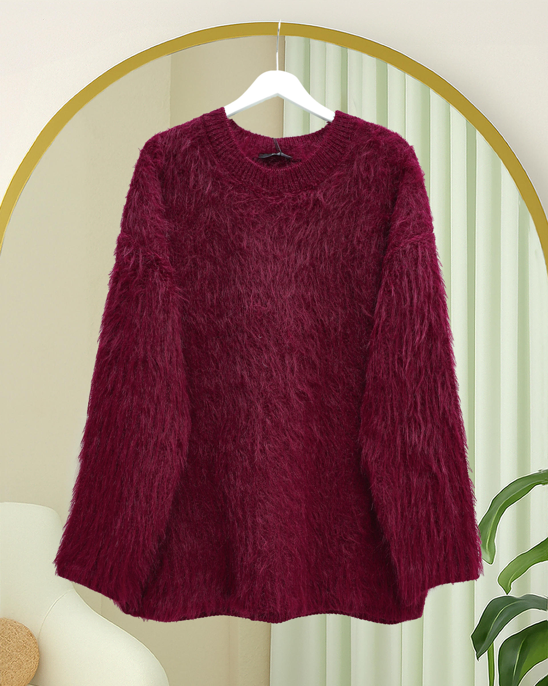 Yuvarlak Yaka Sakallı Triko Kazak -Bordo-Bordo