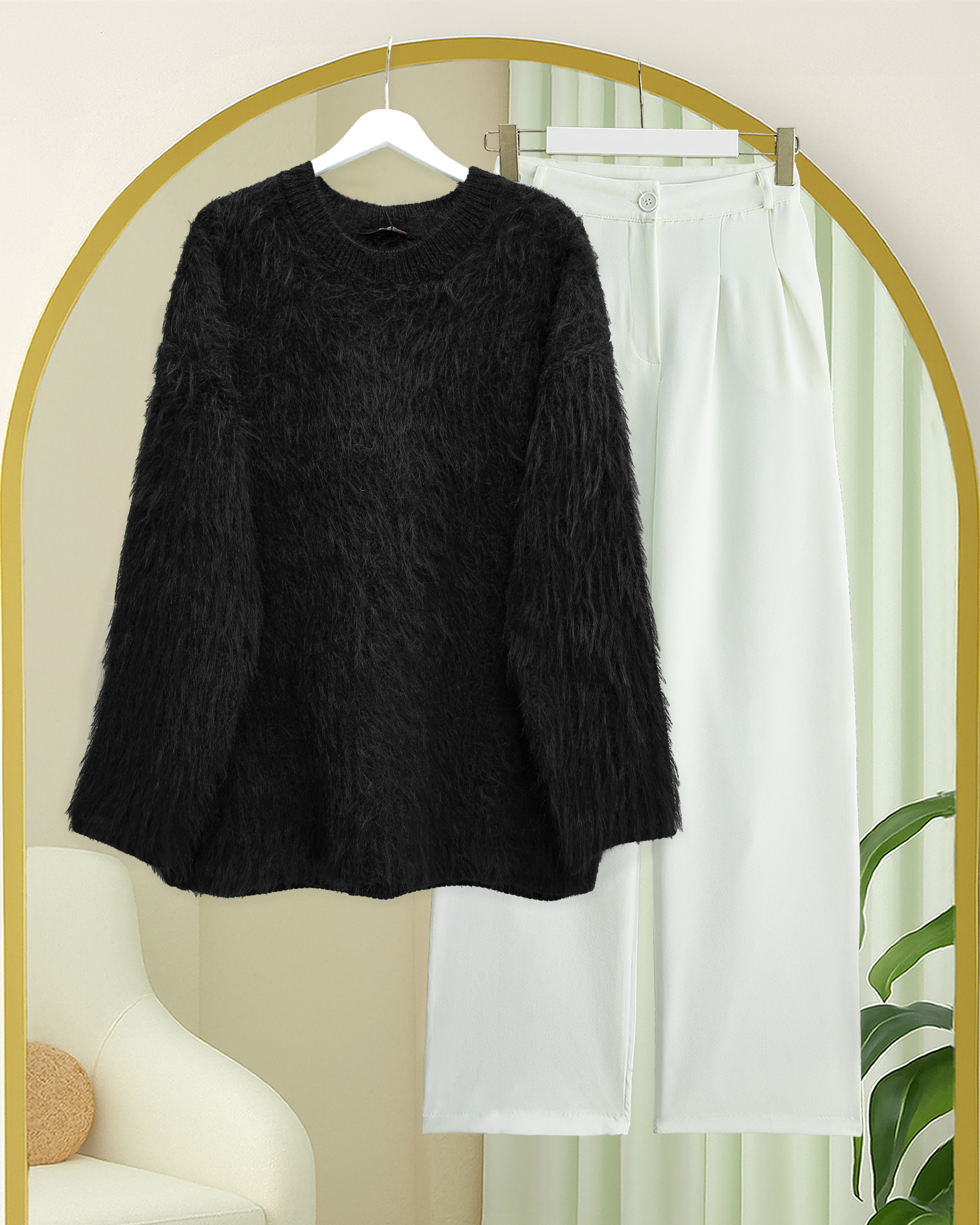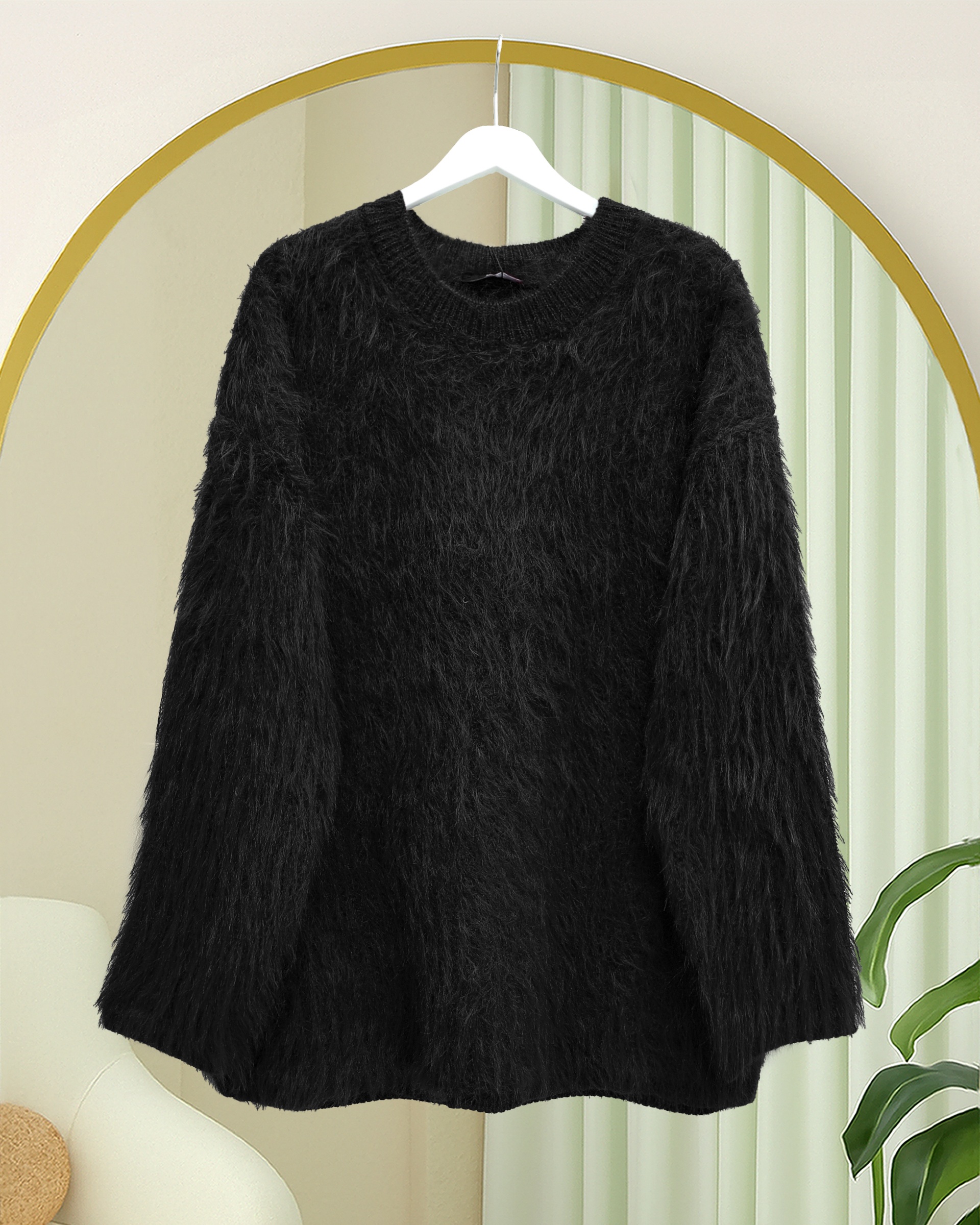 Yuvarlak Yaka Sakallı Triko Kazak -Siyah-siyah