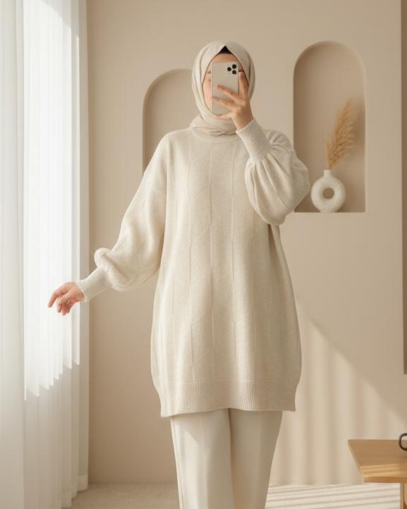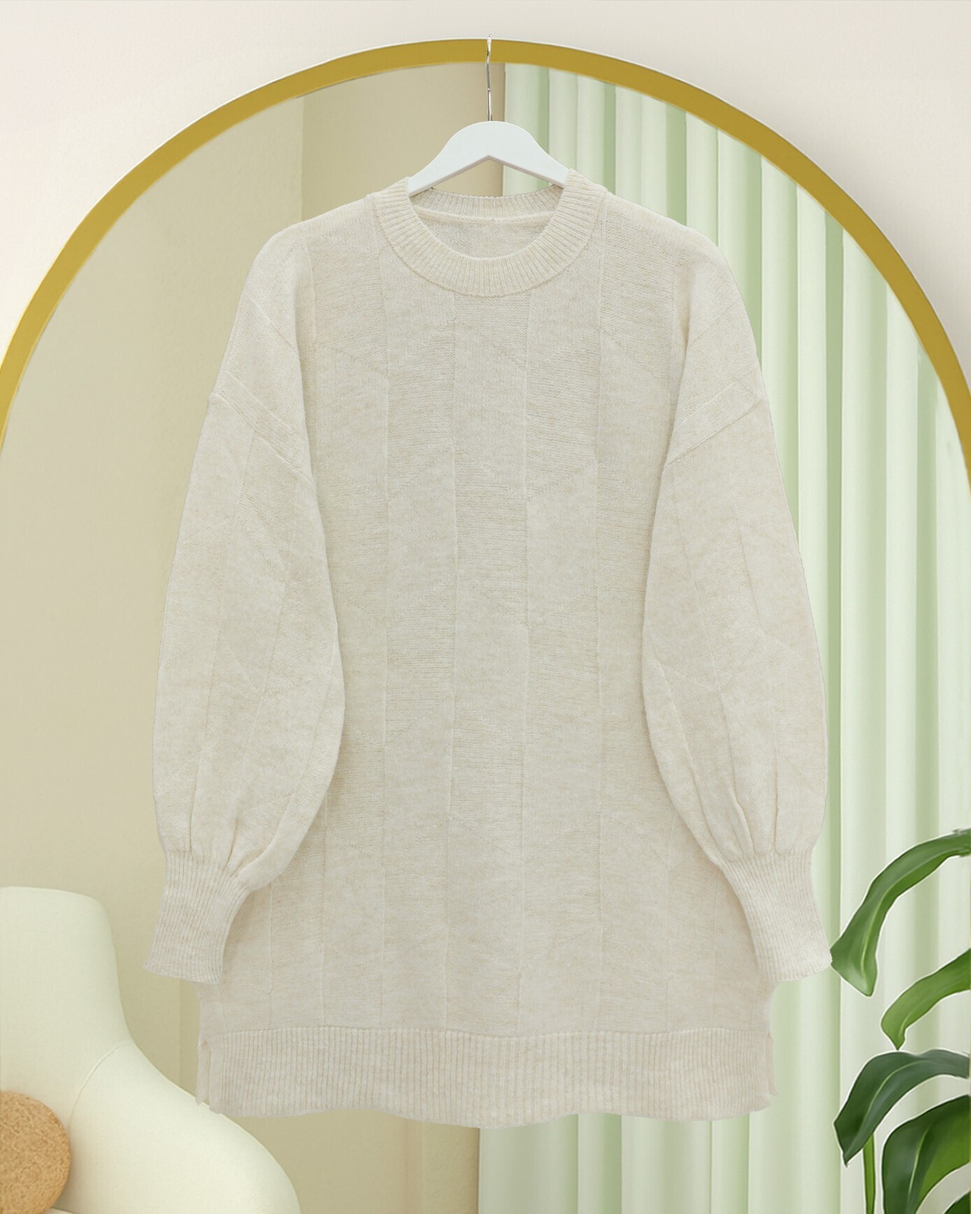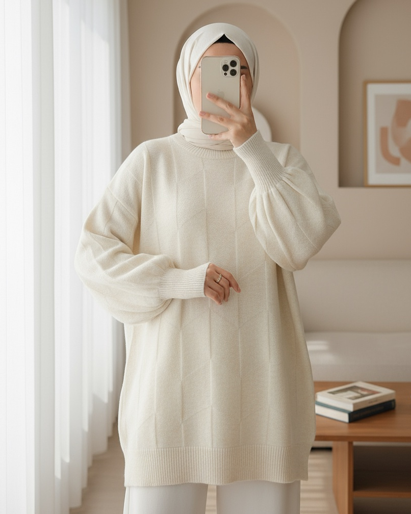 Yuvarlak Yaka Salaş Desenli Triko Kazak -Ekru-Ekru