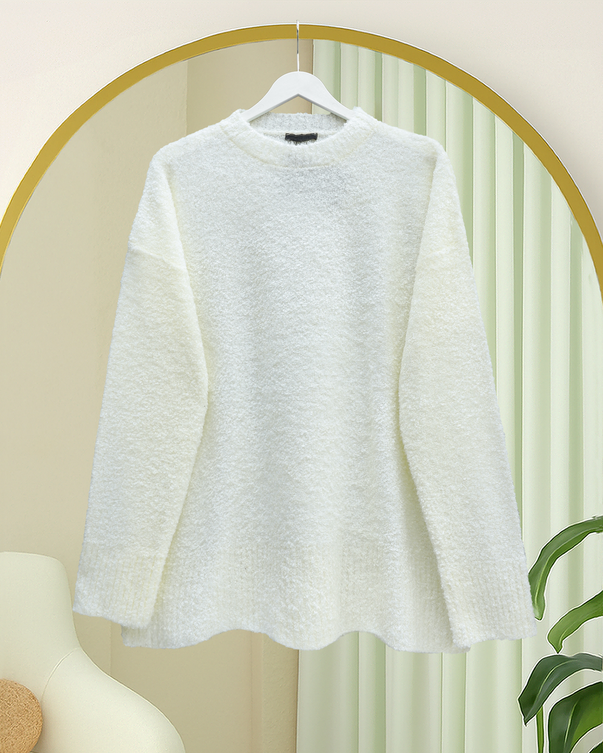 Yuvarlak Yaka Salaş Yumoş Triko Kazak -Beyaz-Beyaz