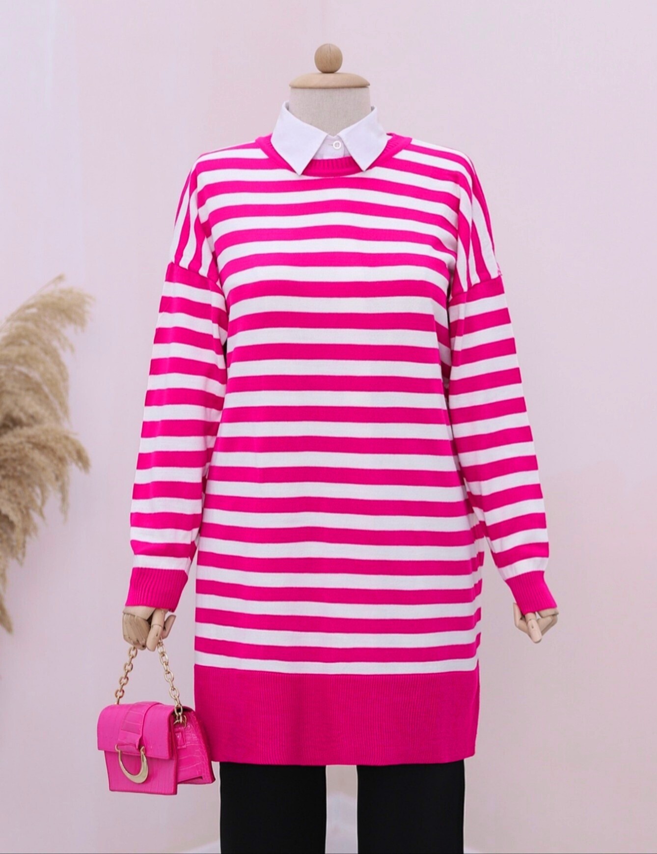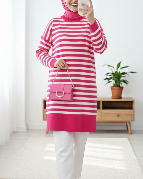Yuvarlak Yaka Tesettür Salaş Triko Tunik -Pembe-Pembe