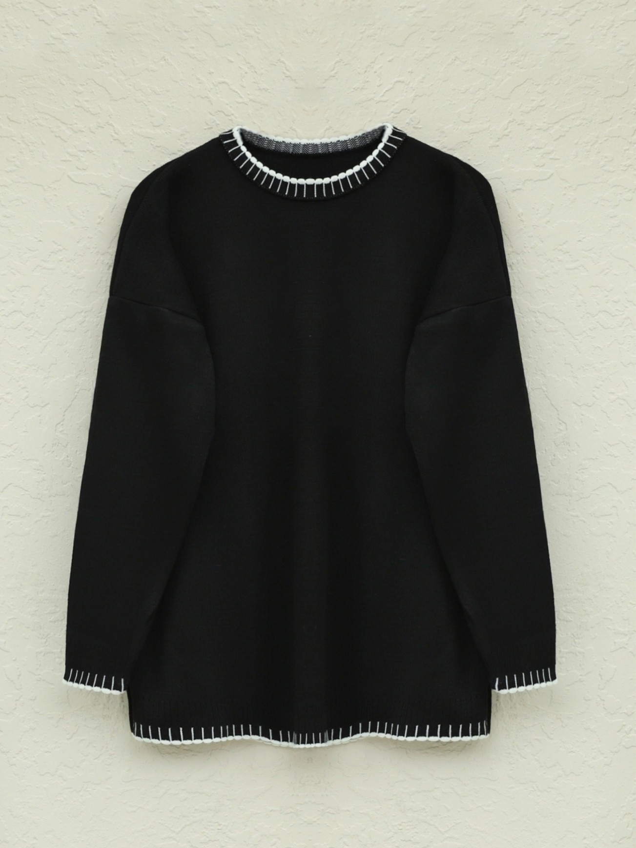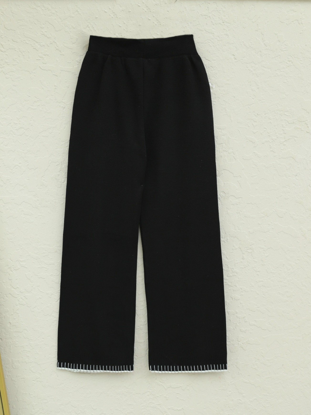 Yuvarlak Yaka Uçları Nakış Detaylı Triko Takım -Siyah-siyah