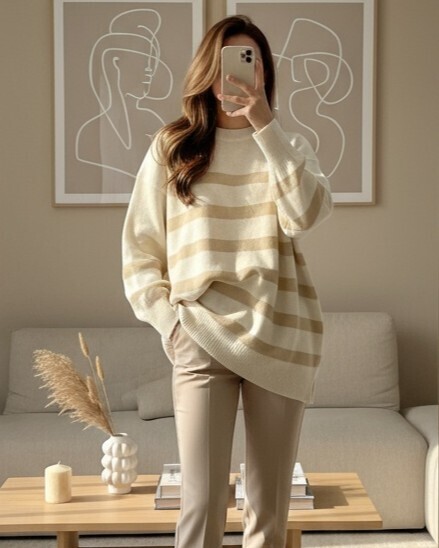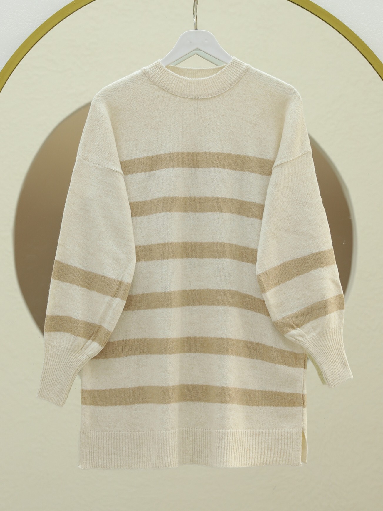 Yuvarlak Yaka Yırtmaçlı Triko Tunik -Açık Vizon-Açık Vizon