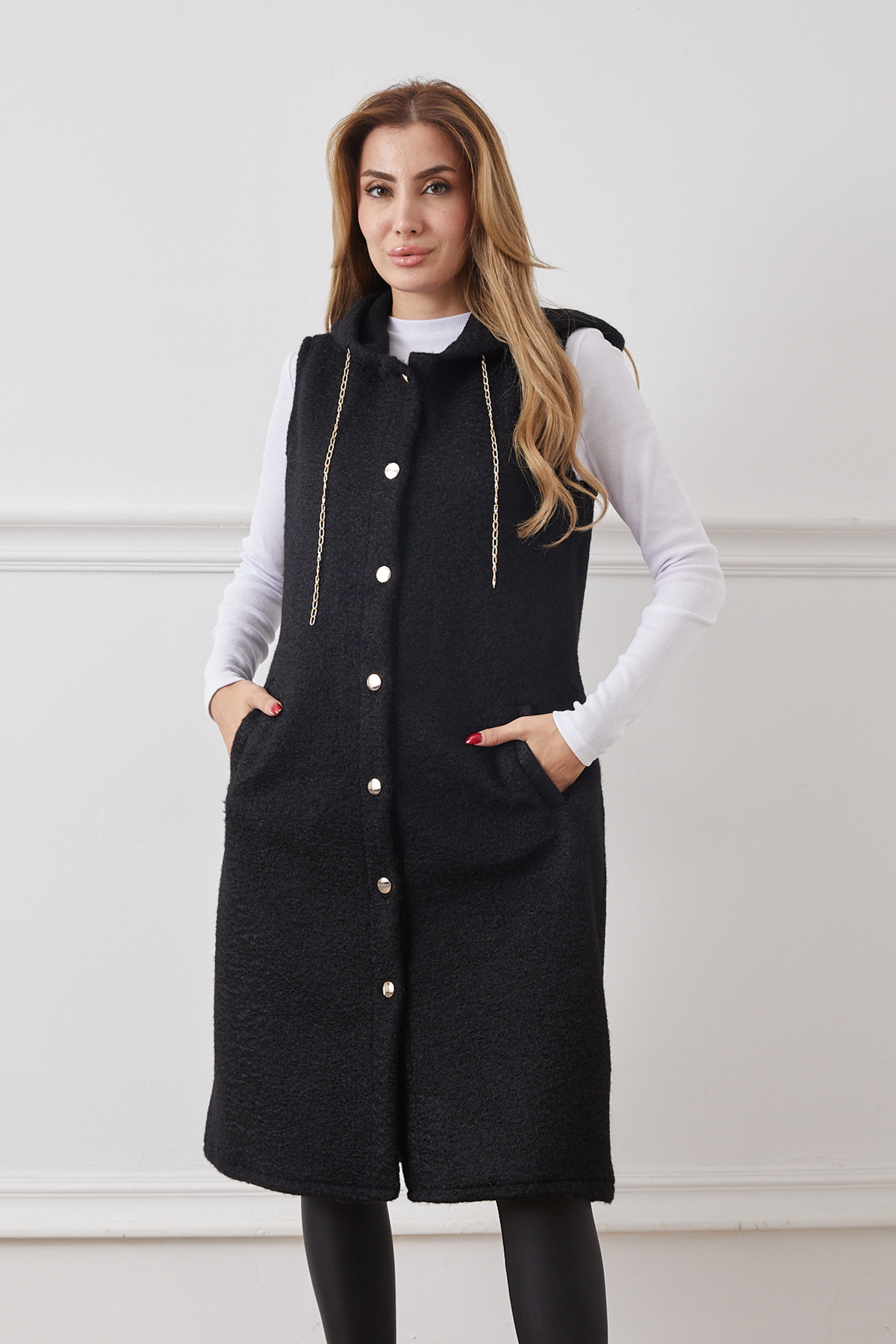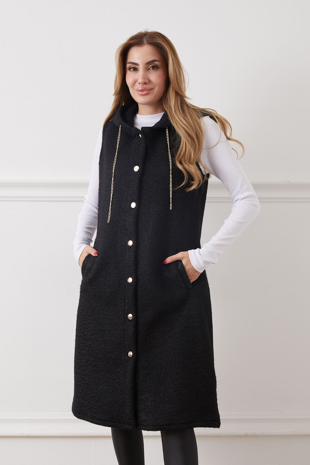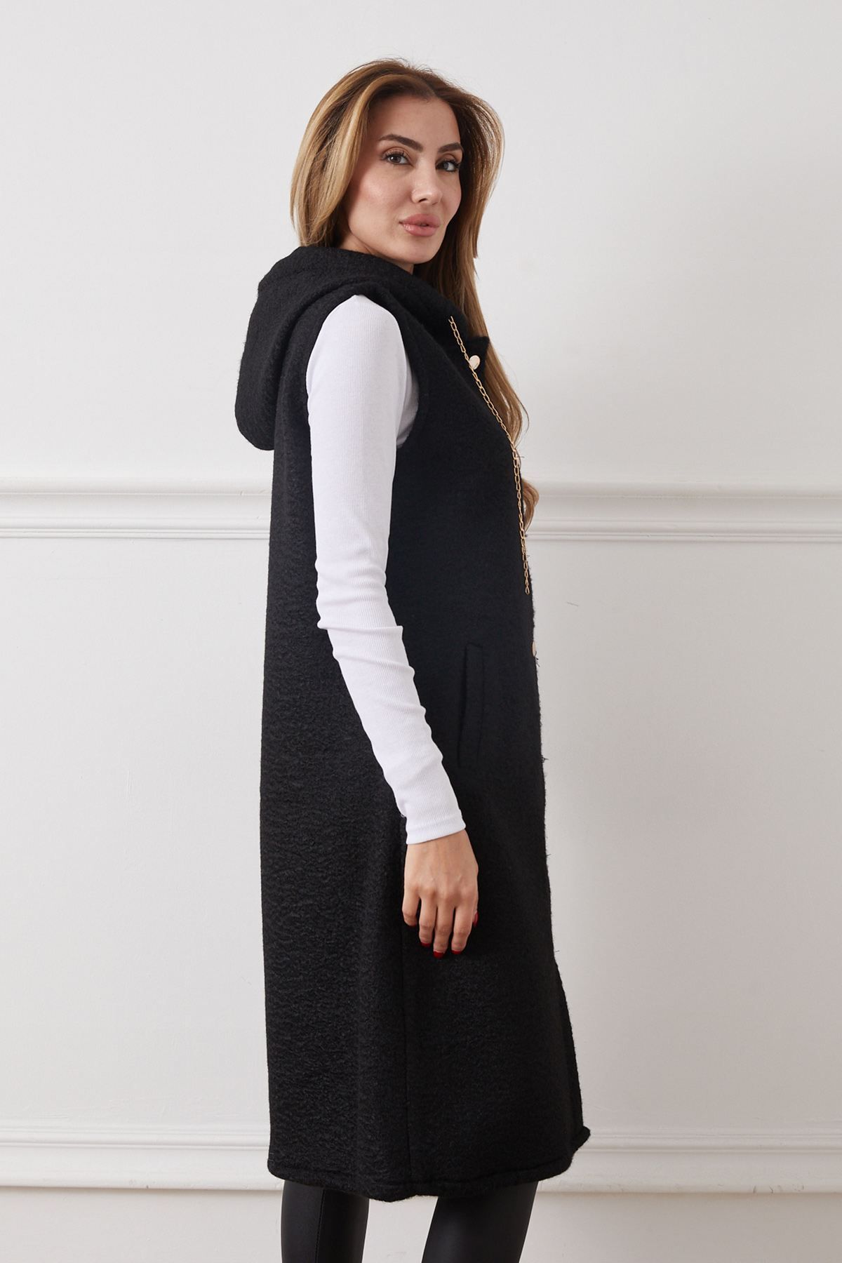Zincir Detaylı Kapüşonlu Uzun Buklet Yelek-Siyah