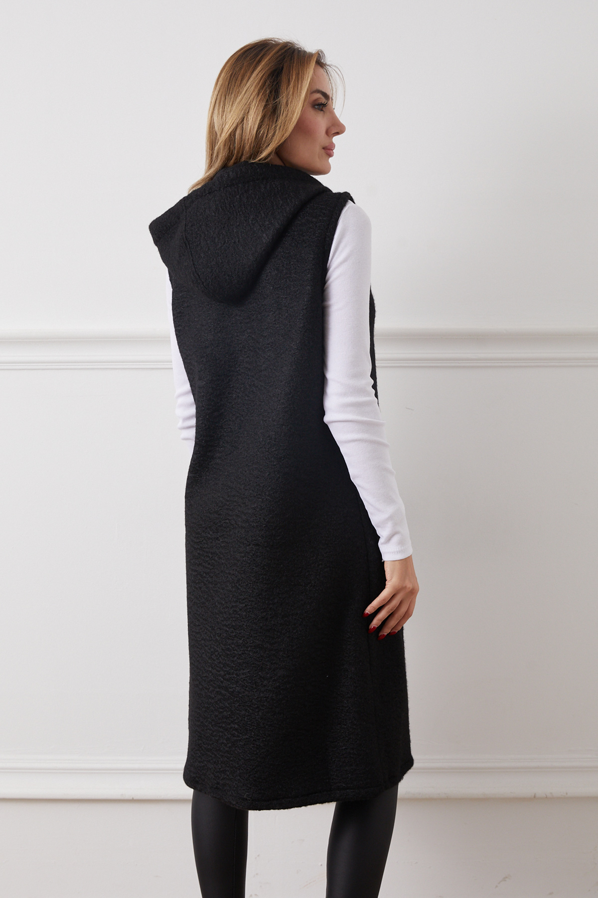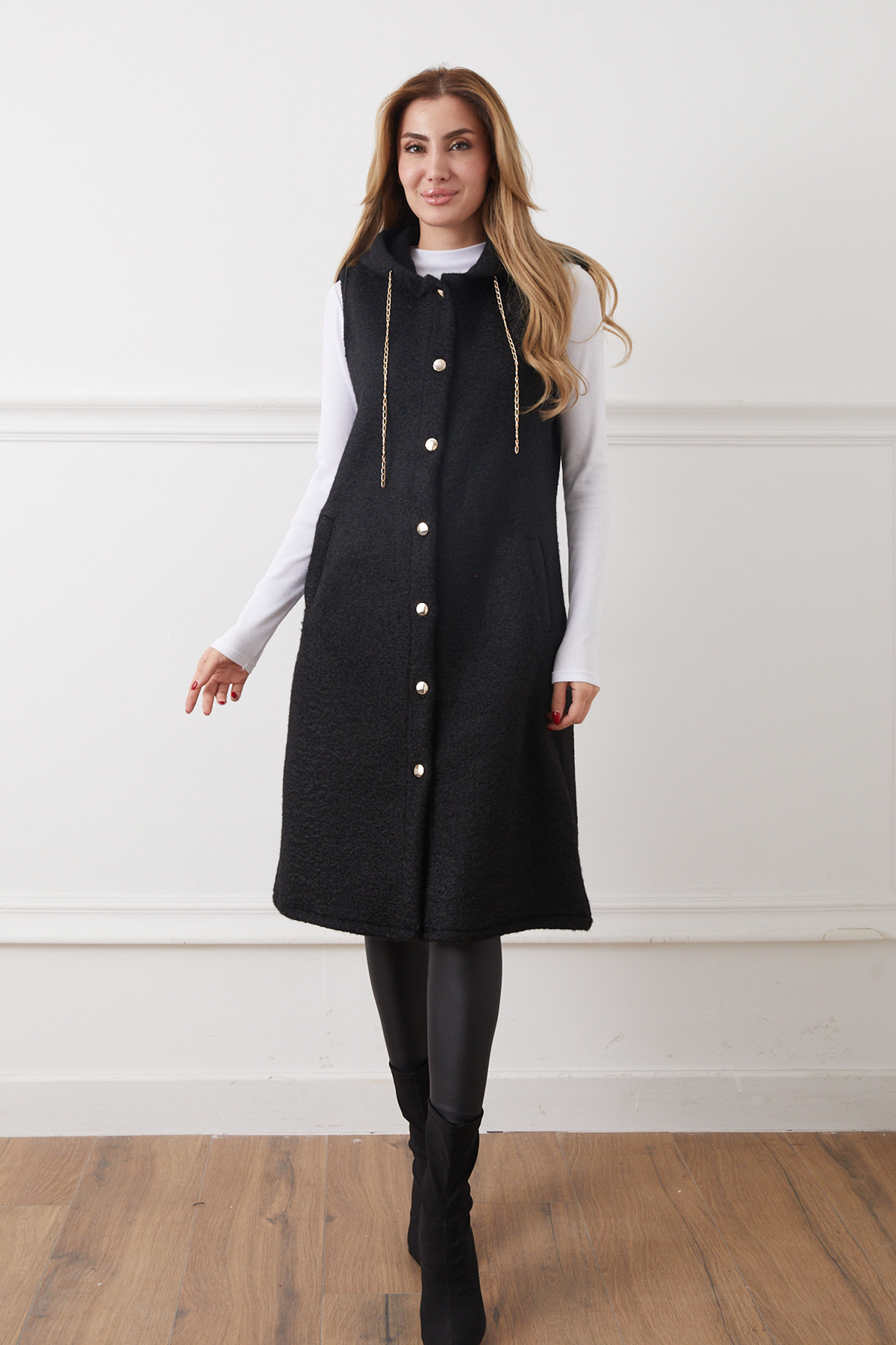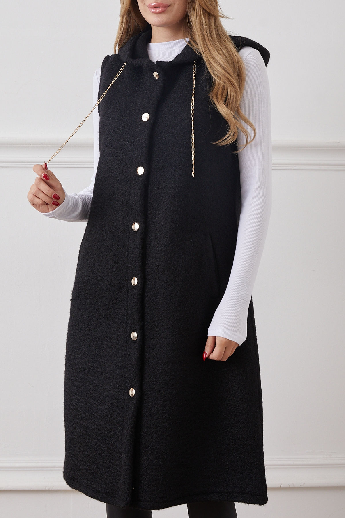 Zincir Detaylı Kapüşonlu Uzun Buklet Yelek-Siyah